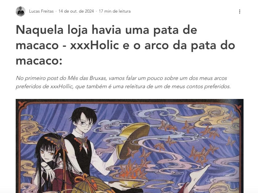 E já que falamos sobre médiuns, fantasmas e outras entidades sobrenaturais, deixo aqui o link de um artigo que escrevi lá na Galeria, onde analiso um dos meus arcos preferidos de xxxHolic :
